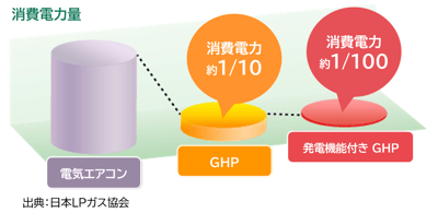 また、GHPは夏場の電力需要の3割以上を占めるといわれる冷房需要を抑制できるため、電力ピークカットに貢献し、年間を通じた電力需要の平準化にもつながります。