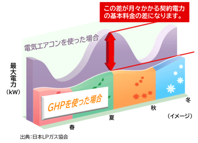 一方で、GHPは消費電力が少ないため、受変電設備の容量を抑えやすく、契約電力の抑制ひいては基本料金の低減にもつながります。